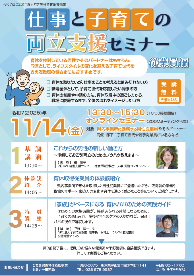 【11月14日・無料オンラインセミナー】職場全体で男性育休を知ろう!「仕事と子育ての両立支援セミナー」のご案内