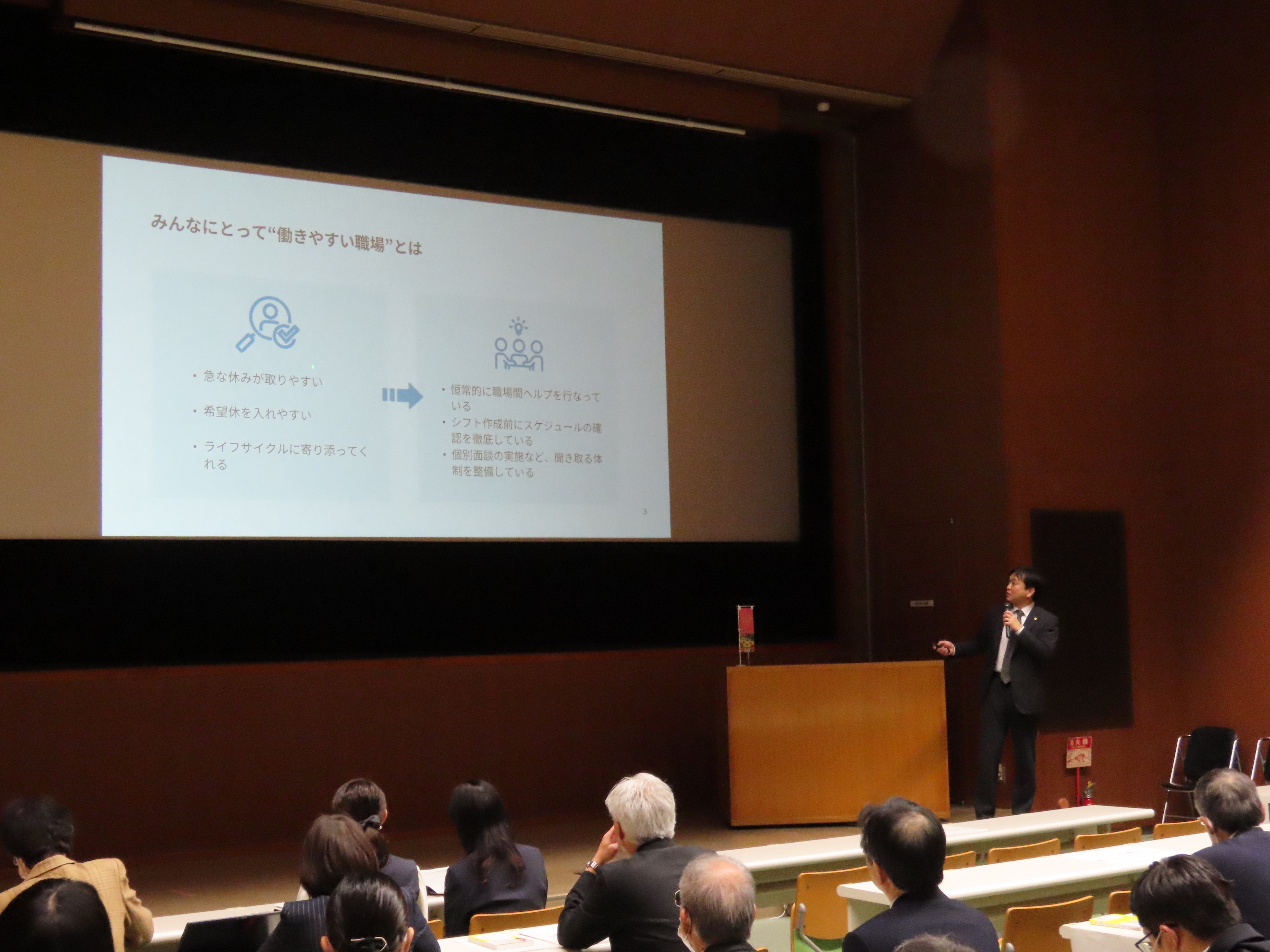 第1部では、「男女生き活き企業」の表彰式を行い、知事から今年度の優秀賞受賞企業2社へ表彰状を授与し、第2部では受賞企業がその取組について事例発表を行いました。